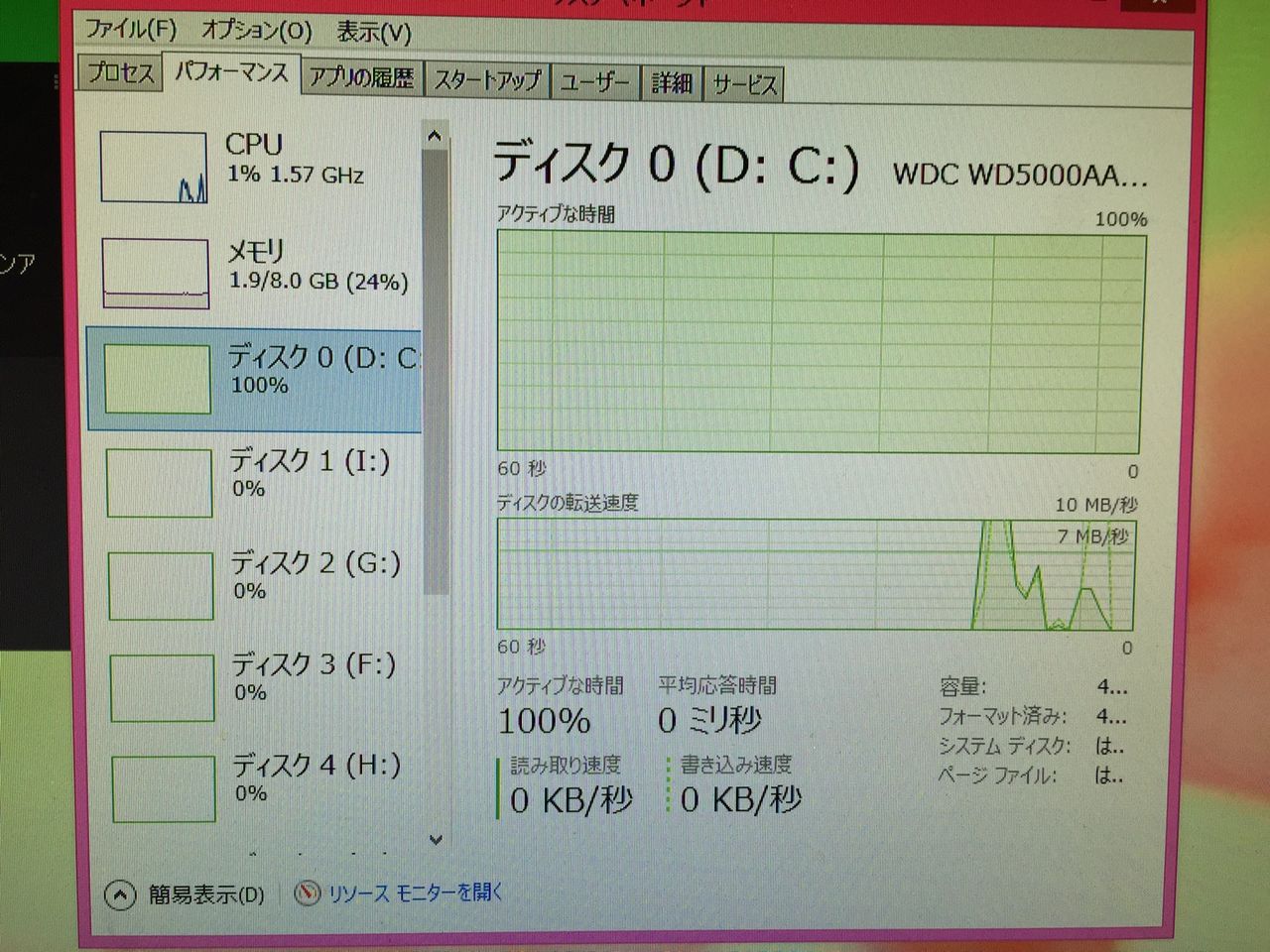 で、Cドライブへのアクセスが100%になったまま下がらないだけでなく、ありとあらゆる動作がすべて重くなって