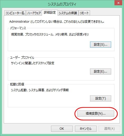 「詳細設定」タブ一番下の「環境変数」ボタンから環境変数窓を開いて、