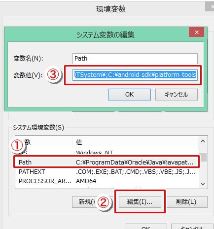 「変数値」の欄に、「;C:\android-sdk\platform-tools」を追加 する。 注意ポイント2