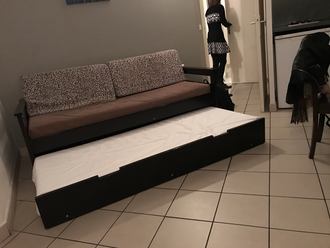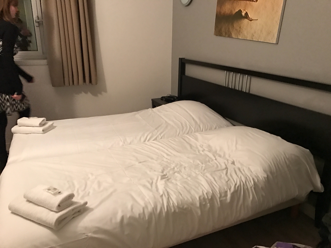 2人用の部屋だけど、ソファの下からベッドを引き出せるので、それを使えば4人まで泊まれるよ、という部屋。