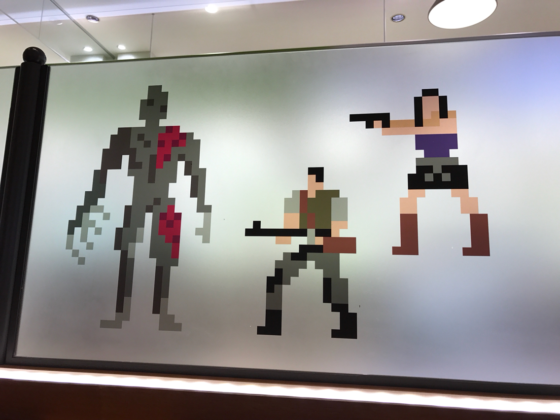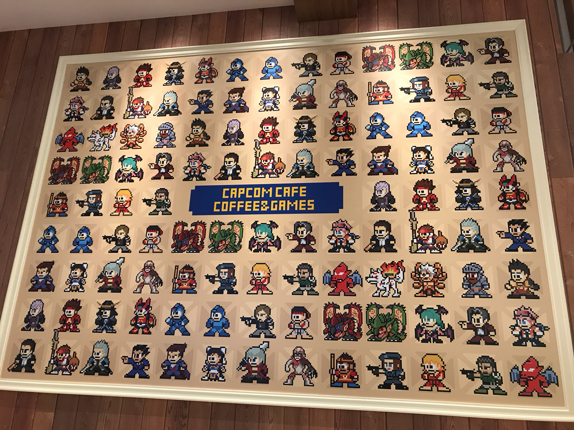 壁にはカプコンのゲームキャラクターがロックマン風ドット絵で。