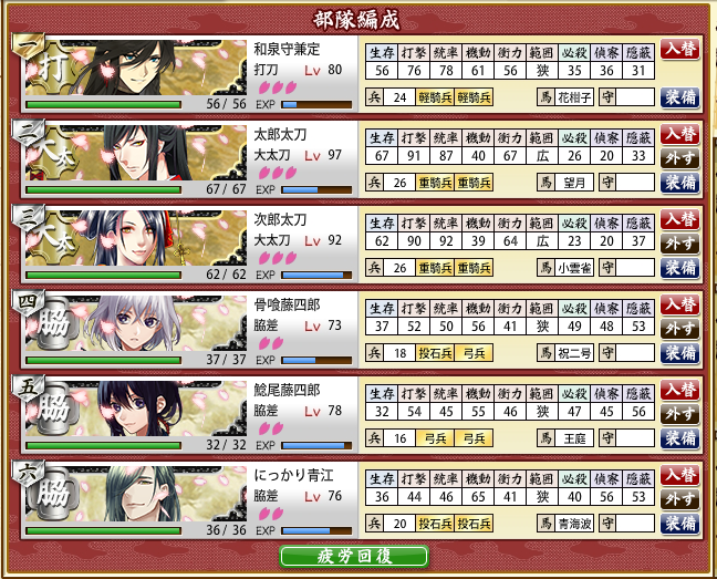 この編成なら、秋田藤四郎の刀装が剥がれたところで撤退する形にすれば間違いは起こらんだろう」