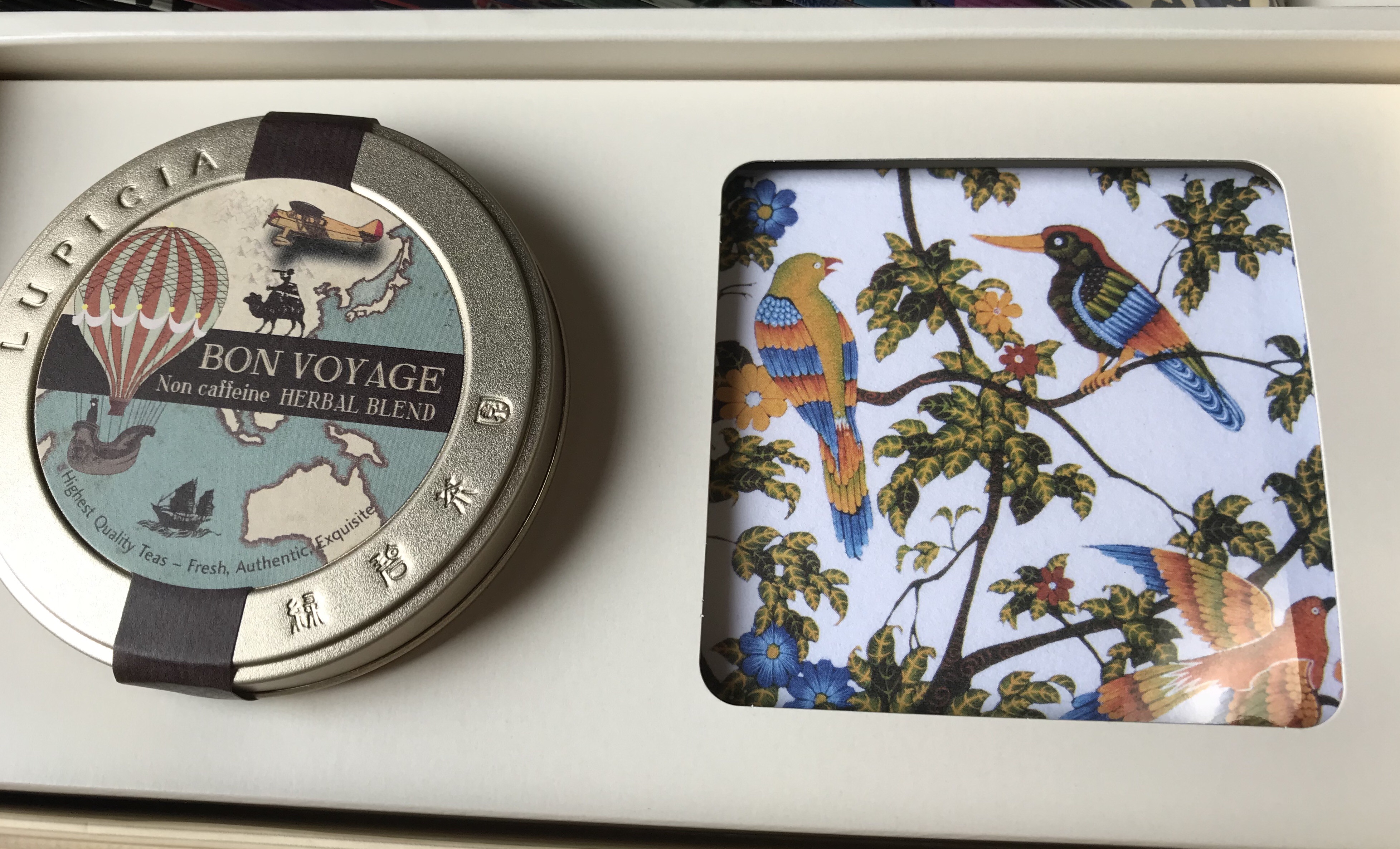 「BON VOYAGE」の缶と、コースター5種。