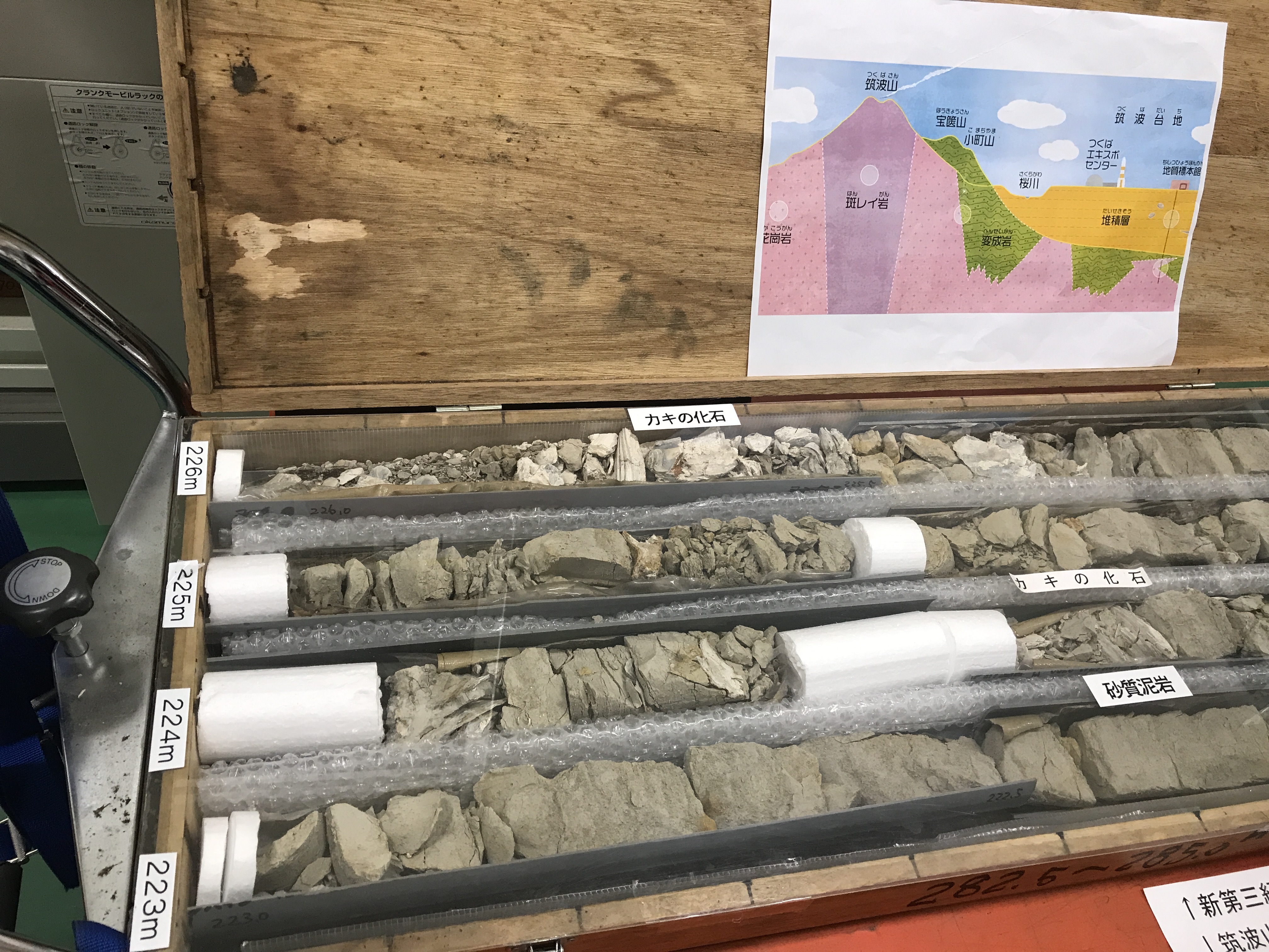 室内に並んでいたのは千葉県や埼玉県で取ってきたボーリングコアと、そこから作り出した地層図など。